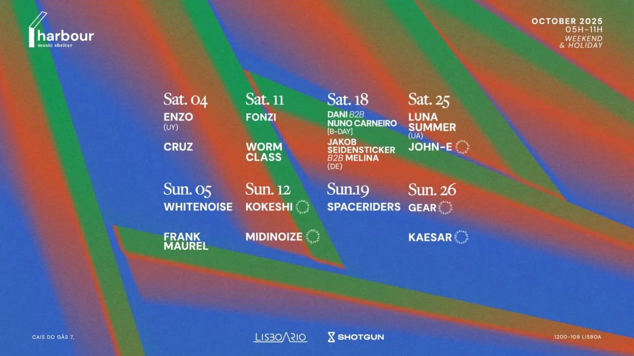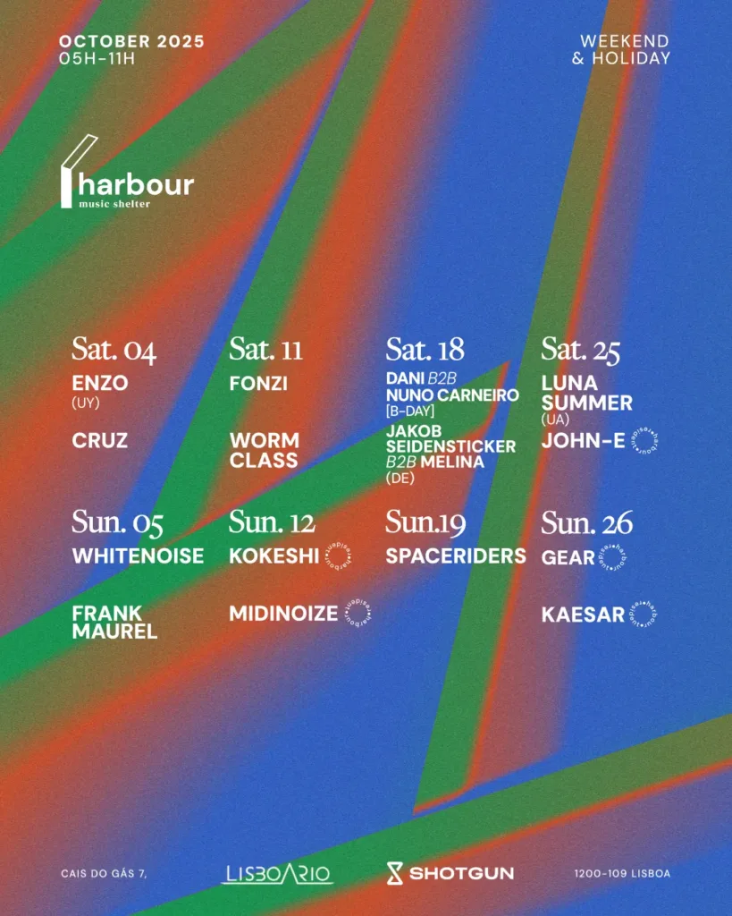 Get Tickets Next Events Get Tickets Calendar Check Calendar Music Shelter Breakfast will be served by ENZO + CRUZ Starting October 4, 2025 to October 4, 2025 View Event Music Shelter Breakfast will be served by WHITENOISE + FRANK MAUREL Starting October 5, 2025 to October 5, 2025 View Event Sundaze Sundaze will be hosted by MIMI + HÉLIO Starting October 5, 2025 to October 5, 2025 View Event Latest Read All SlamWe were thrilled to be at the Champalimaud Foundation once again.ByHarbour TestimonialsNext Sunday you can smoke as many cigarettes as you like.ByHarbour TestimonialsSofia, the smart one.ByHarbour TestimonialsBeach in the After.ByHarbour Artist Roster All Artists GearResidentinstagramsoundcloudlink KaesarResidentinstagramsoundcloud MidinoizeResidentinstagramsoundcloud KokeshiResidentinstagramsoundcloud João MiguelResidentinstagramsoundcloud Bernardo VazResidentinstagramsoundcloud John-eResidentinstagramsoundcloudlink